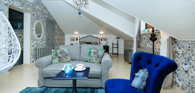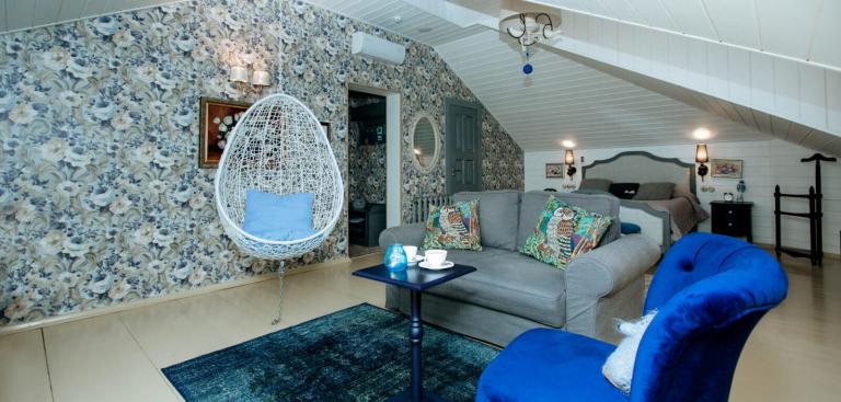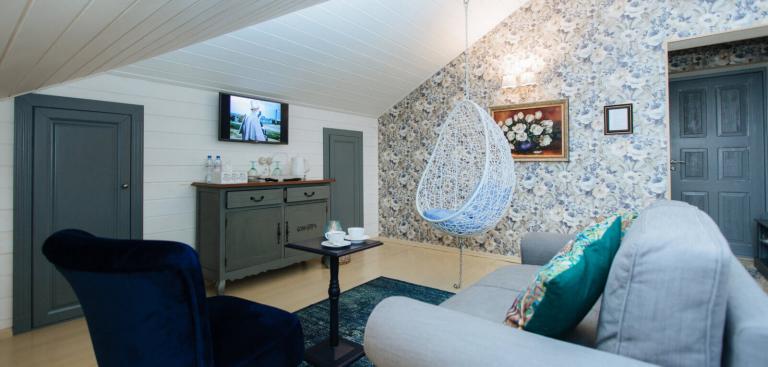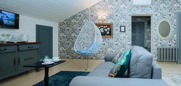 Комфортабельный двухкомнатный номер с панорамным видом на Волгу. Подходит для двоих гостей, с возможностью добавления дополнительного места. Этот номер удивит даже самых требовательных постояльцев: двуспальная кровать размера king size (180 см), 3D телевизор в гостиной, ЖК-телевизор, телефон, холодильник, сейф, система индивидуального кондиционирования, бесплатный Wi-Fi, электрический чайник с чайным набором, а также просторная душевая с белоснежными халатами, тапочками, набором принадлежностей, феном и устройством для укладки волос. Особенностью номера является элегантная белоснежная ванна на резных ножках, идеальная для любителей отдыха. В интерьере учтены все детали: от печки-буржуйки до очаровательных сувениров в виде сов.