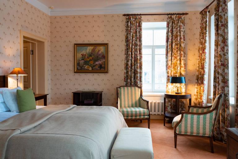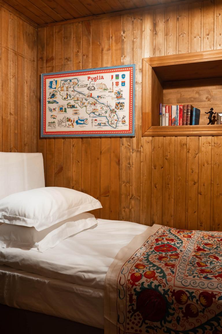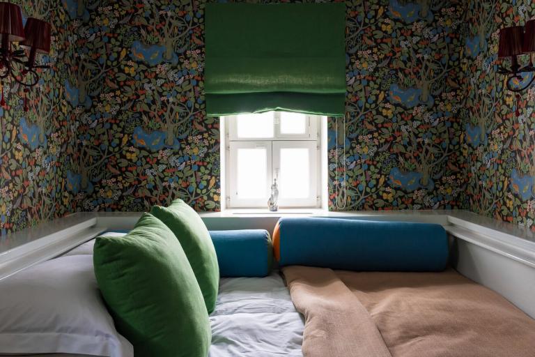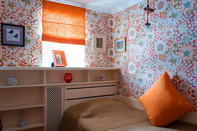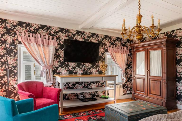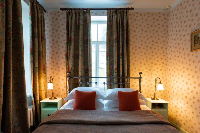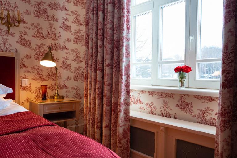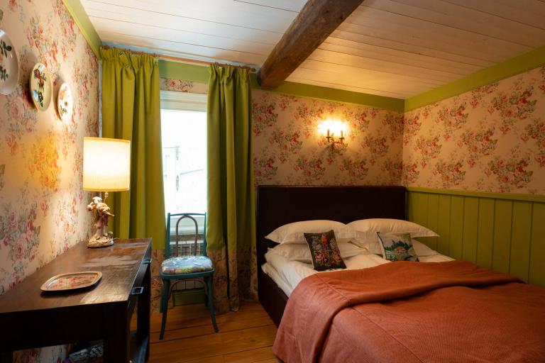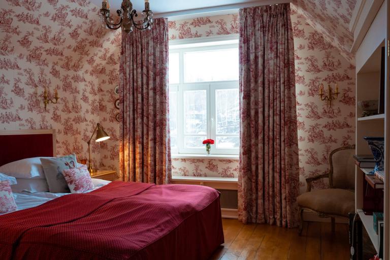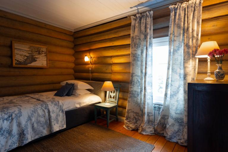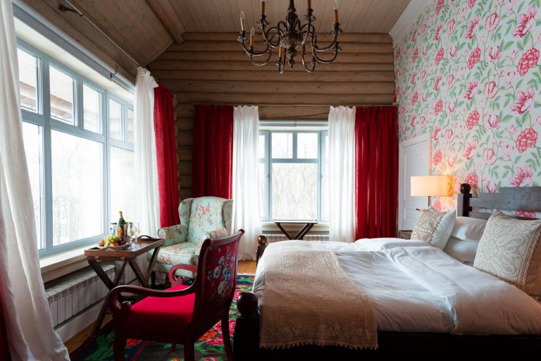 Дом с двумя спальнями, одна с видом на двор и двуспальной кроватью, другая — миниатюрная с окном на Левитан-холл и односпальной кроватью. Есть санузел с душем и кухня-столовая. Граничит с музеем Левитана.