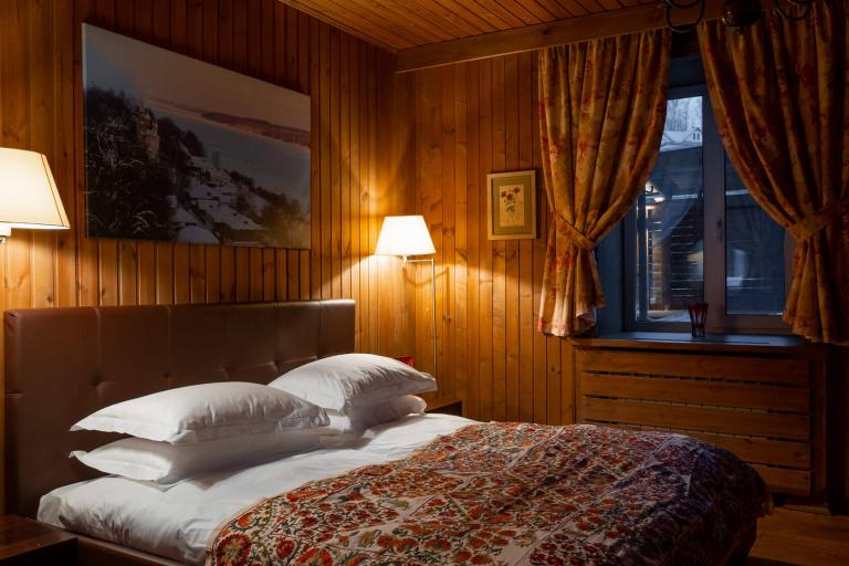 Дом Философовых: три спальни, две на мансарде, одна на первом этаже. Два санузла, кухня-столовая в русском стиле. Дворики для парковки и отдыха. Фасады с видами на гору Левитана и речку Шохонку.