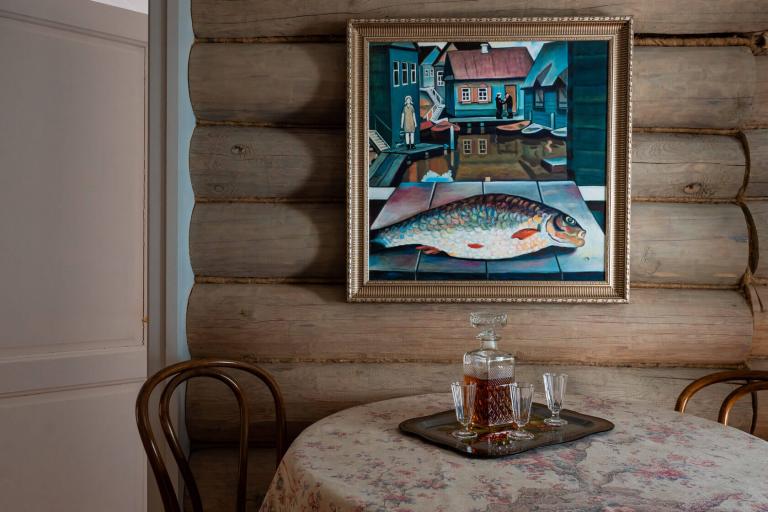 Дом с двумя спальнями: главная с кроватью 180 см и видами на Волгу, малая с кроватью 160 см. Площадь 61 кв.м. включает санузел, душевую и кухню. Интерьер сохраняет русскую старину. Дом назван в честь художника Юрия Жаркова.