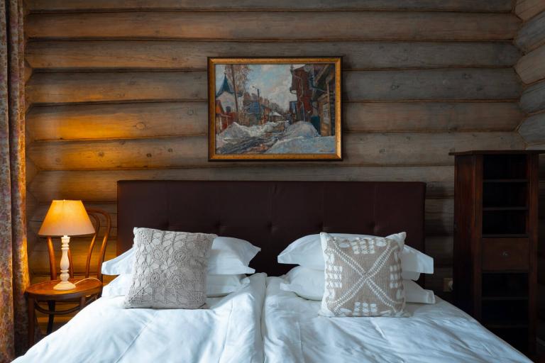 Дом с двумя спальнями: главная с кроватью 180 см и видом на Волгу, малая с кроватью 120 см и окном в сад. Площадь 51 кв.м. включает санузел с душем и кухню-столовую. Уникальный дом с открытыми бревенчатыми стенами и галереей.