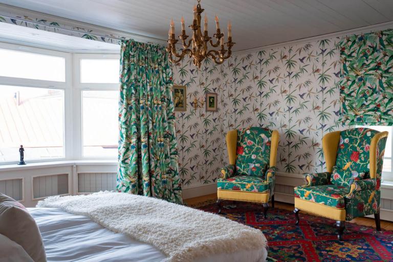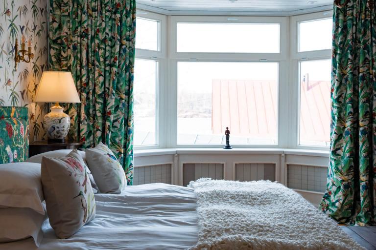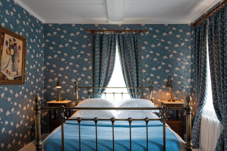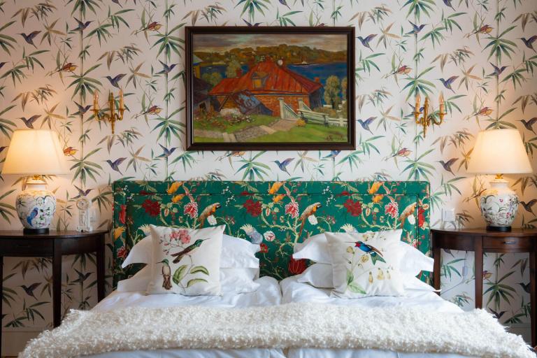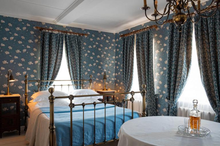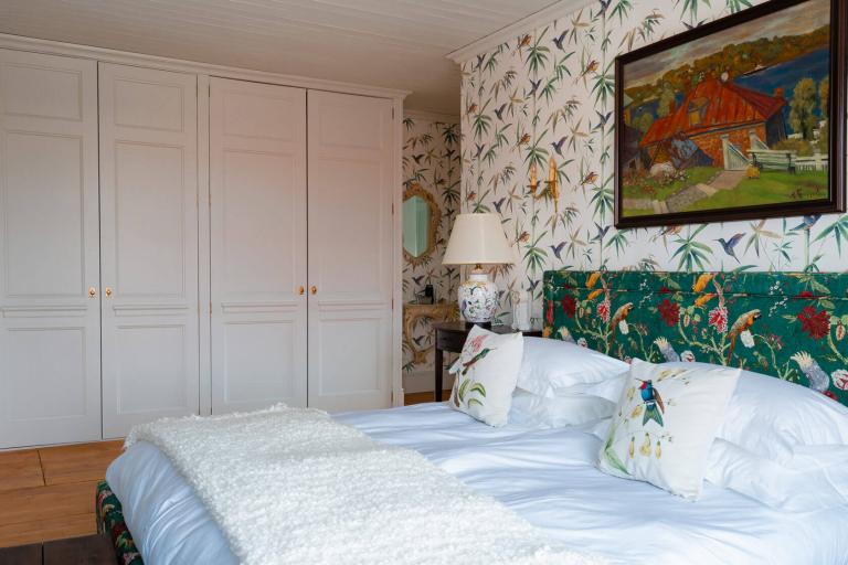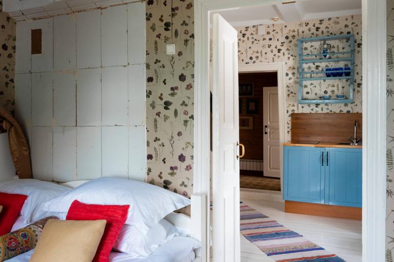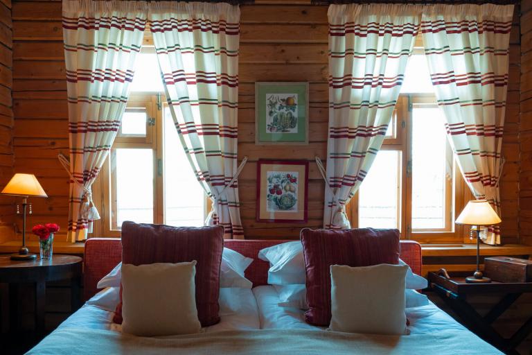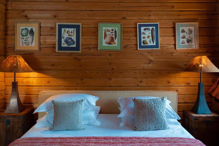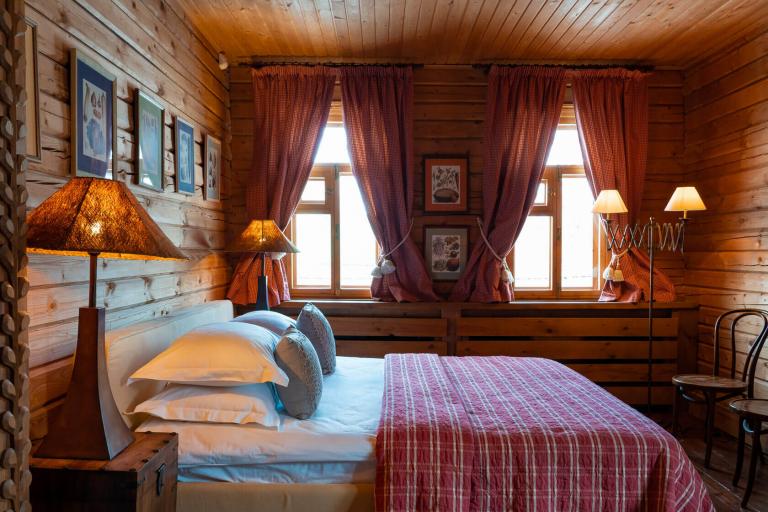 Амбар «Миловид» предлагает две просторные спальни: главная с потолком 4 метра, двумя панорамными окнами, лиственничным полом и тиковой кроватью (180 см); вторая спальня на верхнем этаже с кроватью 160 см. Дом с площадью 95 кв.м. вмещает 3-4 человека и имеет один санузел с душем.
