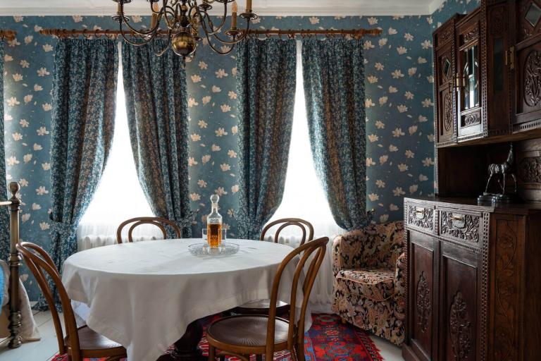 Гостиная оборудована столом на четыре персоны, уютным диваном, телевизором и барной зоной с кухней, включающей столешницу из слэба морёного дуба, микроволновую печь и мини-холодильник.